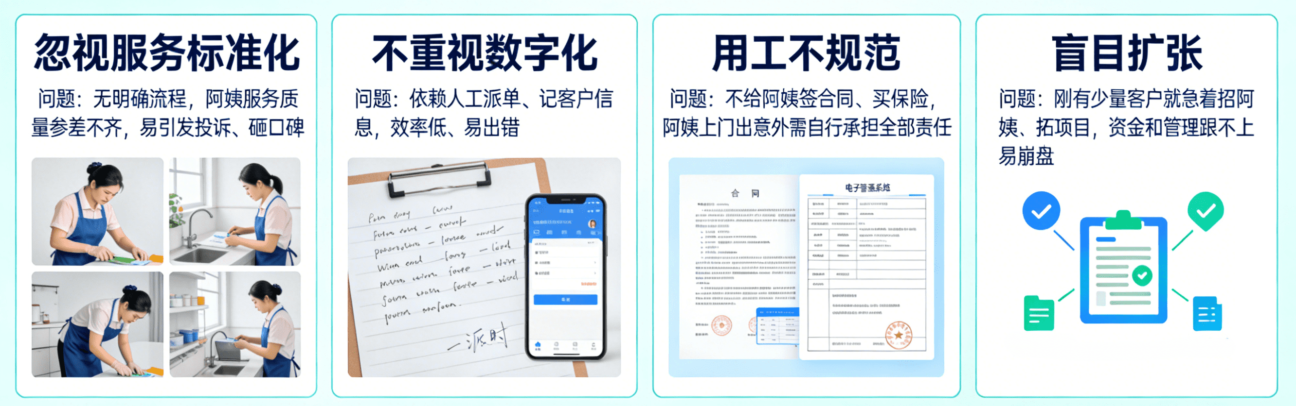 · 盲目扩张:刚有少量客户就急着招阿姨、拓项目,资金和管理跟不上易崩盘。避坑:稳扎稳打,先做好基础服务、积累稳定客户,再逐步拓展。
